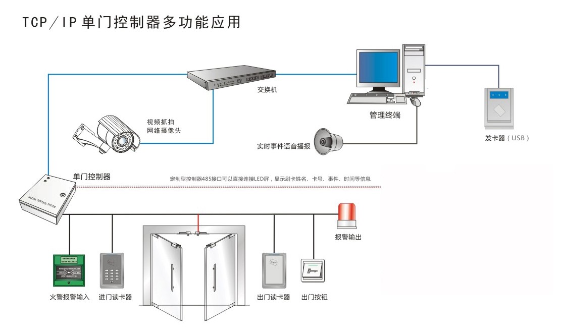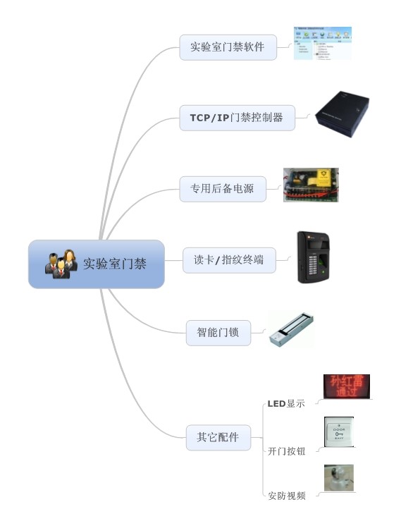 门禁系统采用“读卡器+门禁控制器+门禁服务器+工作站”的模式。 可外接LED屏显示实验室的使用情况,也可外接摄像头实现刷卡抓拍及录像,还可以外接报警器。