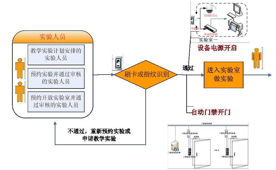 学生通过教学实验安排、开放实验预约、创新实验室预约后,刷卡或指纹识别进入实验室,门禁设置采用“进门刷卡,出门按钮开门”的方式,整个门禁系统由控制室统一监控,对各出入口的位置状态、出入对象及出入时间等进行实时控制或设定程序进行控制。门禁管理根据实际情况实现“集中管理、分散控制”的方式,各个操作员由系统管理员授权,操作员可实现多级管理。